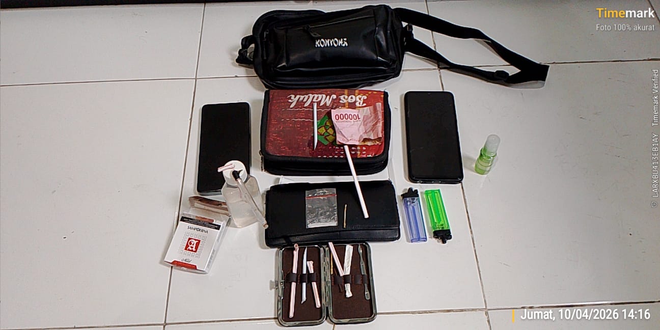 Dalam penggeledahan tersebut, petugas menemukan satu poket serbuk kristal yang diduga narkotika jenis sabu yang disembunyikan di dalam bungkusan rokok milik terduga pelaku GE. Selain itu, petugas juga mengamankan alat hisap (bong), sejumlah pipet, korek gas, telepon genggam, serta uang tunai sebesar Rp210.000.
