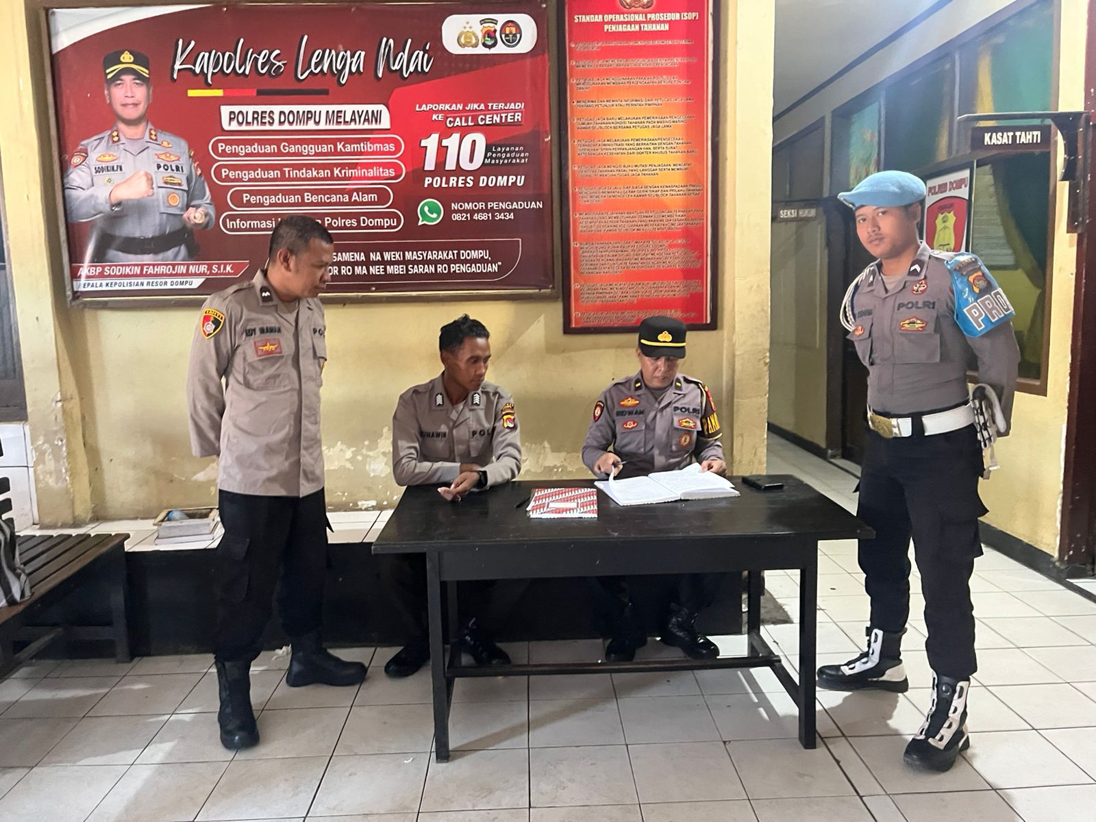 Kegiatan tersebut dilaksanakan bersama anggota piket SPKT dan piket Tahanan dan Barang Bukti (Tahti) Polres Dompu, dengan tujuan memastikan kesiapan personel yang bertugas serta kondisi para tahanan tetap dalam keadaan aman dan terpantau.